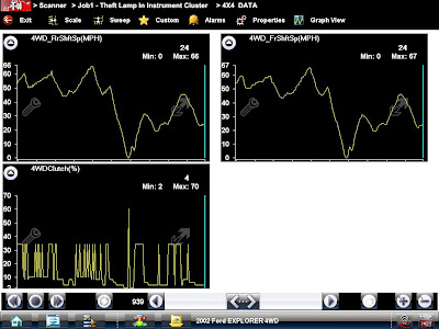 At this point I had already checked the speed sensors and scan tool readings. The wiring diagram I was using showed a wire from the PCM to the 4×4 module which was not really marked. I figured it was the TPS input but when I hooked up a voltmeter to the wire at the 4×4 module it did not look like a typical TPS reading. I dug around a bit and found this in the Description and Operation: “The PCM converts the TPS signal to a pulse width modulated signal, and sends it to the 4×4 electronic module to control and adjust the transfer case clutch duty cycle.”